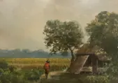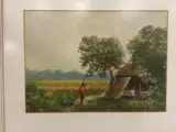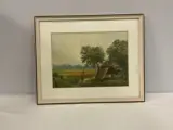 Aangeboden: mooie aquarel van landschap, met een man bij een hut.