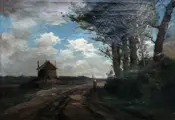 het schilderij stelt de weg naar het dorp voor, van een oude vrouw door het bos, met een lucht bedekt met pluizige witte wolken, in het landschap vind je een oude molen, en in de verte zie je de toren van een kerk