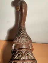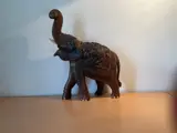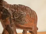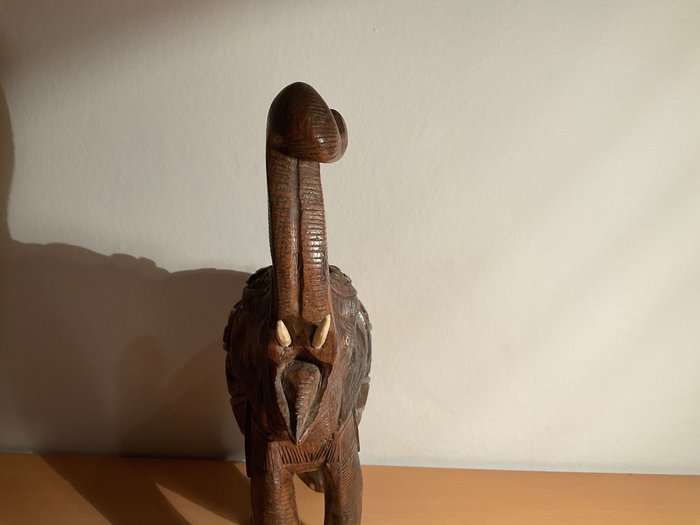 Deze zwaar uitgesneden massief donkerbruine teakhouten olifant weegt bijna 3 pond. Het is 32 cm hoog van voet tot punt van de romp, ongeveer 12 cm breed en 23 cm lang van slagtand tot staart. Hij weegt 1.322 kg. De stam wordt verhoogd als teken van geluk. Zijn slagtanden en tenen zijn van ivoor.