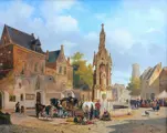 Een interessant perspectiefeffect nodigt u uit in de aarde naar de stad vanaf een gotisch plein op de markt.