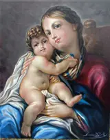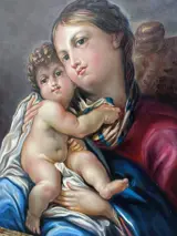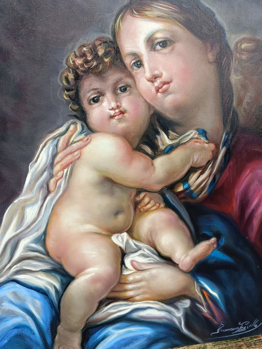 Een olie die een zeer geliefd iconografisch onderwerp vertegenwoordigt, een prachtig werk van de Madonna del Rosario.