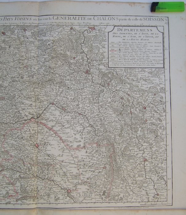 1780-gedateerde, ongebruikelijke XX-grote, 2-bladige, oudgekleurde kaart van de Champagne, door Delisle, zeldzame bijgewerkte staat om de situatie na de Franse Revolutie te illustreren, met de nieuw gecreëerde 6 departementen
