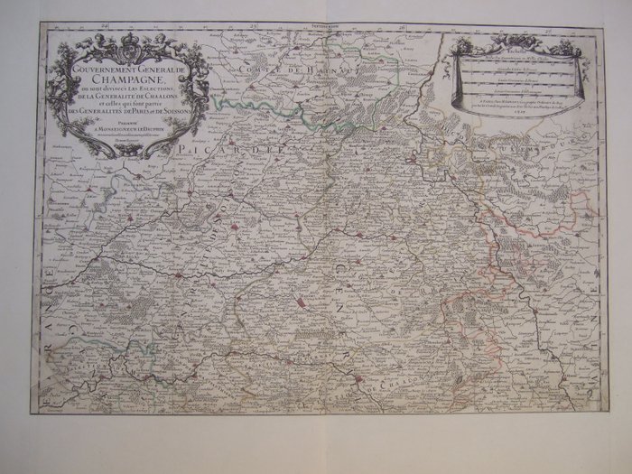 1717-gedateerde, Ongewone XX-grote, 2-bladige, oudgekleurde kaart van de Champagne, door Hubert Jaillot [de meest productieve kaarteditor van Frankrijk in zijn tijd].