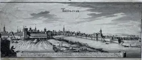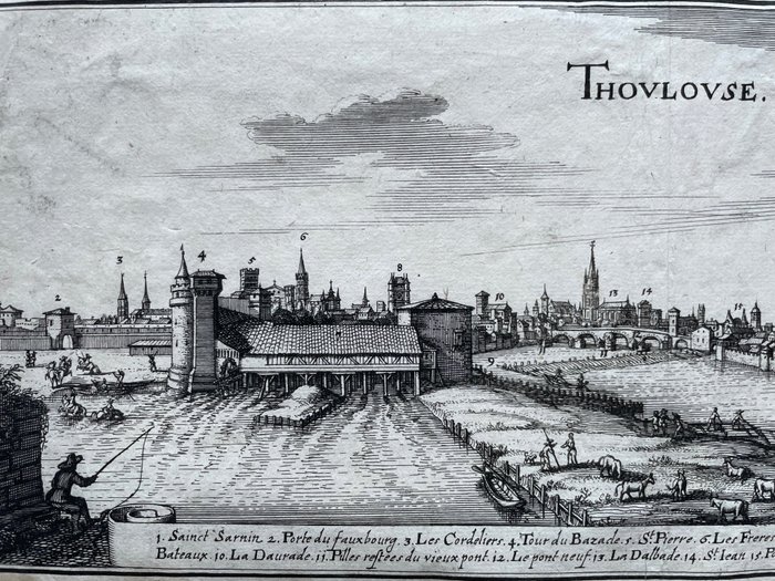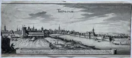 Gezicht op de stad Toulouse, op de voorgrond de rivier de Garonne. In een guirlande onderaan legenda 1-18 in het Frans