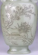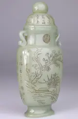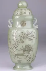 Het beeld is zeer fraai: vaas met naar de zijkanten uitlopende bloementakken, merkteken en kalligrafie fijn ingesneden aan de zijkanten en de bovenkant.