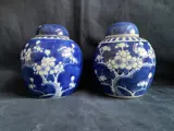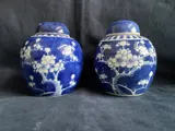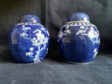 2 fraai gekleurde blauw/ witte Chinees porselein gemberpotten met prunus versiering. De potten zelf zijn in een perfecte staat, 1 van de deksels heeft een haarlijntje van 6 cm