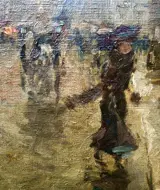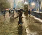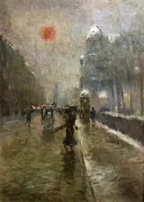 Avondgezicht bij zonsondergang in Parijs rond 1900 met bewegende figuren en paardenkoetsen.