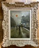 Olieverf op doek gemonteerd op een lijst, omlijst door een Montparnasse gebeeldhouwde houten lijst.