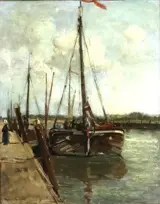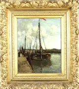 Een werkelijk schitterend kunstwerk ( "afgemeerd schip", olieverf op paneel ) van de Nederlandse kunstenaar Gerard Koekkoek (1871-1956). 4de Generatie Koekkoekgeslacht! Met authentieke vergulde lijst. Gesigneerd links onder. Afmetingen met lijst: 65 cm. x 57 cm. Paneelmaat: 41 cm. x 32,5 cm. De algemene conditie van het werk is goed. De lijst heeft enkele gebruikssporen. Het werk is te bezichtigen bij Kunsthandel Martins te Wolvega en wordt geleverd met een echtheidscertificaat.