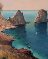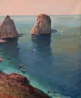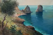 Het schilderij is acryl en pastel op canvas van 30x45 cm met een weergave van de faraglioni in Capri