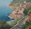 Het schilderij is acryl en pastel op canvas van 30x30 cm en toont een uitzicht op Positano