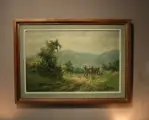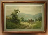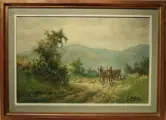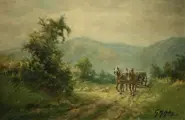 Zeer fraai werk in olieverf op paneel voorstellenden een landschap met een boer en paard en wagen.