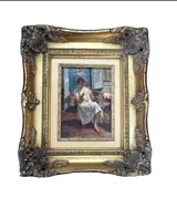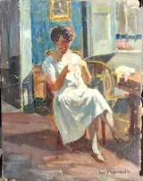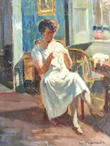 Olieverf op paneel voorstellende een vrouw binnenshuis, gesigneerd G. Kienerk rechtsonder.