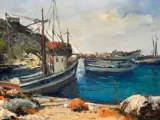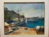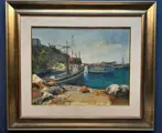 Verfijnd en elegant olieverfschilderij van de kunstenaar Giovanni Pane met een suggestief en aangenaam zeezicht met vissersboten van het beroemde Corricella-gebied in Procida van prachtig vakmanschap en picturale kwaliteit