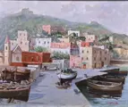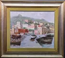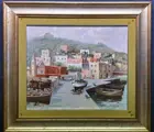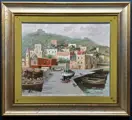 Mooi en aangenaam olieverfschilderij op canvas van de kunstenaar geboren in Isernia in 1922 Goffredo Villa met een uitzicht op de kleine haven van Baia in de Golf van Napels, zeer goed gedaan met tal van details en prachtig vakmanschap en picturale kwaliteit