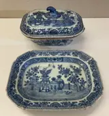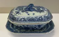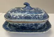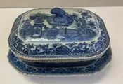 Groentekom en dienblad in blauw en wit geverfd en geglazuurd keramiek, Qing-dynastie, 18e eeuw. Gebreken aan de dekselknop zoals blijkt uit gedetailleerde foto's, verder in goede algemene staat. Groenteschaal meet 10 x 11,5 x 18 cm; afmeting dienblad 3,2 x 13,5 x 19 cm Afkomstig uit een privécollectie in Genua. Verzending via landelijke koerier met professionele verpakking.