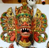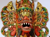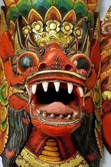 Hierbij een heel bijzonder groot en schitterend Barong muurmasker bestaande uit drie houten delen, zie ook de foto's.