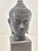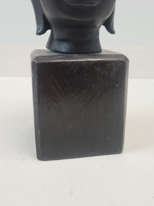 Prachtig groot gecoat bronzen Boeddha hoofd, gemonteerd op een houten voet