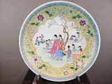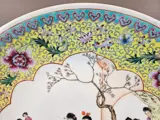 Grote Chinees midden 20e eeuw. Famille Rose schotel met voorstelling van dames in de tuin, merk Qianlong.