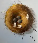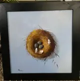Super mooi werk van Henk Poeder 1964 betreft een vogelnestje met drie eitjes en drie witte dons veertjes schilderij is links onder gesigneerdH Poeder . Henk Poeder maakt stillevens dieren landschappen zeegezichten en nog veel meer . Henknkomt uit een kunstschilders familie zie ook rijks kunst en documentaties in Denhaag. (Rkd) (ook site)