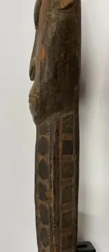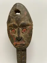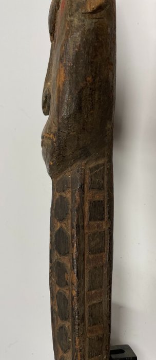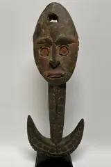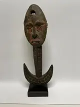 Oude en veelgebruikte haakfiguur, hoofd beschilderd met natuurlijke pigmenten, rug en haak uitgebreid gedecoreerd met geometrische patronen in bas-reliëf