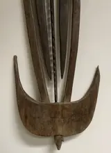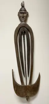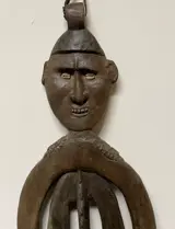 Papoea-Nieuw-Guinea - Midden-Sepik - goed gebruikt vroeg 20e-eeuws ophanghaakfiguur - hoofd ingelegd met kaurischelpen - maskers uitgesneden op de schouders van de figuur - uitgebreid uitgesneden rug - kop van fruitvleermuis onderaan haak.