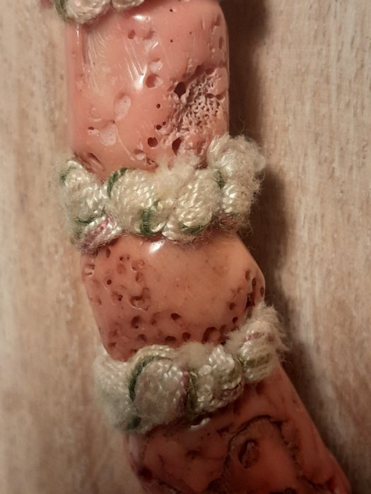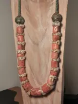 Collier bestaande uit 17 vaten Tiberano fossiel koraal, koper, messing en zijde, ongeveer 60 cm lang en weegt 273 gram, condities zoals op de foto's te zien is.