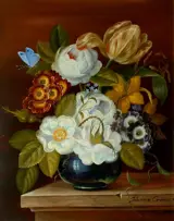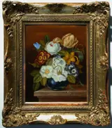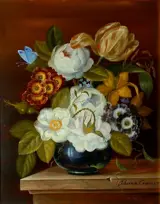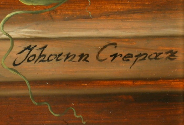 Olieverfschilderij op spaanplaat, geschilderd omstreeks 1960-80 door de Oostenrijkse kunstenaar Hans (Johann) Crepaz. De afbeeldingsmaat van het schilderij is 25 cm x 20 cm, met de lijst 38,3 cm x 33,2 cm. Een redelijk goede originele staat van het schilderij.