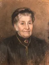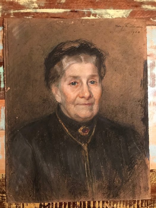 Prachtig, zeer sympathiek portret van een volwassen dame met een edelsteen van rond de 80 jaar oud