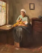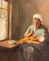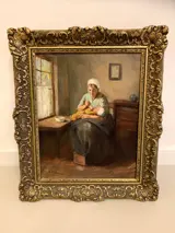 Mooi voorbeeld van een typisch schilderij van Hendrik van Langen. Hij schilderde veel interieur sfeerbeelden, waarvan dit een geslaagd exemplaar is. De maat van het schilderij zonder lijst is 24 x 30. Doek en lijst zijn in goede staat.