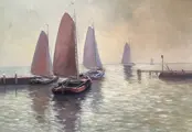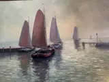 Een sfeervol gezicht op platbodems in de haven van Volendam (lettercode op de zeilen) richting IJsselmeer.