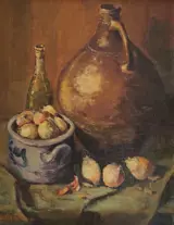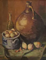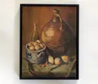 Stilleven met kruik, uien en Keulse pot in luxe lijst.