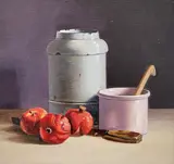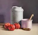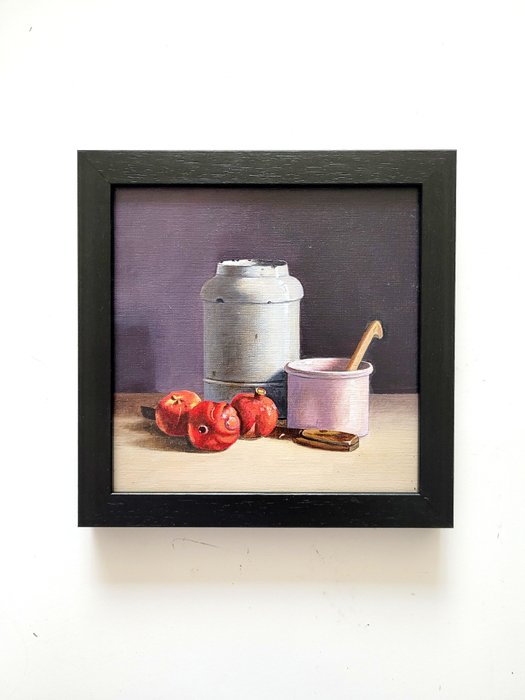 Stilleven met rode granaatappels, potten en mes ongesigneerd (andere werken van deze kunstenaar zijn gesigneerd met AB).