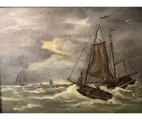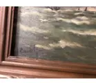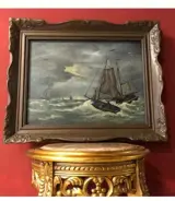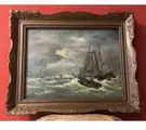 Mooie kunst; retro gesigneerd schilderij zee met oude schip/boot; olieverf op doek(echt geschilderd). Conditie: in goede staat. Afmetingen: L 82 x H 67 cm incl. barok lijst bruin.