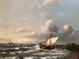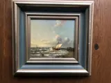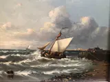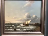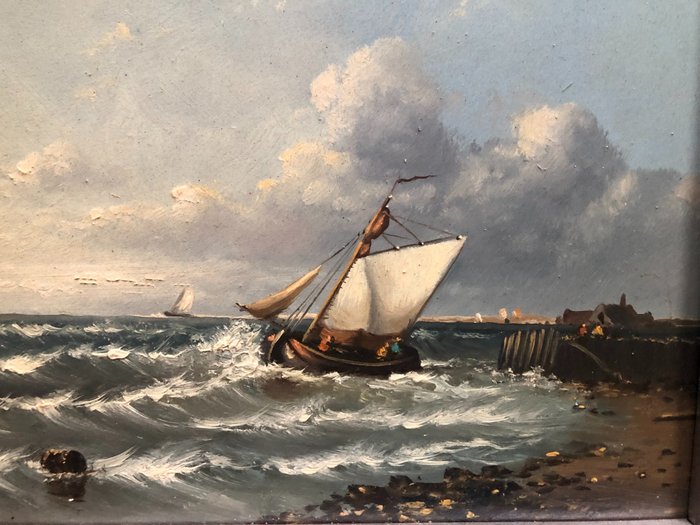 Fraai zeegezicht met zeilschip op woelige zee; olie op eiken paneel, 18x20cm. (schilderij), linksonder gesigneerd "Baas".