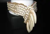 U biedt op een bijzonder oude en zeldzame hoofdband met de typische rij hondentanden in het midden (diende als betaalmiddel) uit het Huon Gulf gebied (of ook te vinden in het Papua Golf gebied!) van Papoea-Nieuw-Guinea .