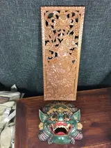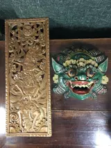 Twee stukken traditioneel Indonesisch houtsnijwerk uit de 20e eeuw, een totemmasker met houtsnijwerk is verfijnd volgens het beeld van de legendarische totem, de kleur heeft een sterk gevoel van nationaliteit, de vorm is levendig en de maat is 228, 226, 108 mm. Ook het andere houten reliëf komt overeen met de legende. De plot is prachtig gebeeldhouwd en de maten zijn: 490, 188, 13 mm. Beide collecties zijn perfect bewaard gebleven.