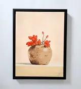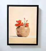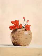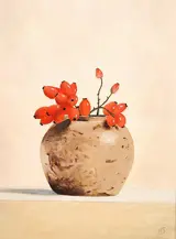 Stilleven met rozenbottels in gemberpot gesigneerd met HS in zwarte baklijst.