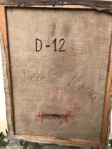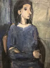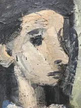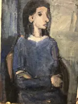 Cubsite acryl olie mixed media schilderij rond 1960 door de Hongaars-Amerikaanse kunstenaar ongelijst 80 x 60 cm geschreven op de rug met verschillende nummers "zwartharige dame met blauwe jurk"