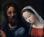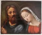 Italiaanse school van het einde van de achttiende eeuw. Madonna met een heilige. Manier van de Renaissance.