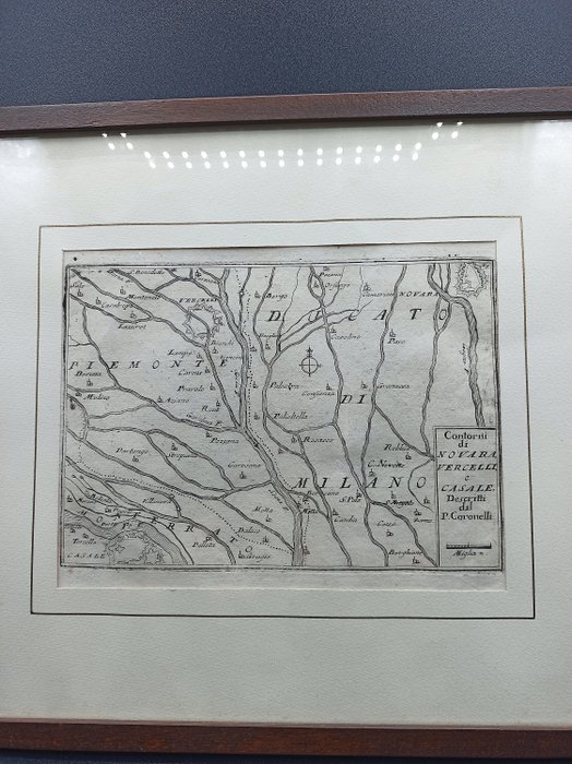 Zeldzame geografische kaart uit 1706 van het gebied tussen Novara, Vercelli en Casale.