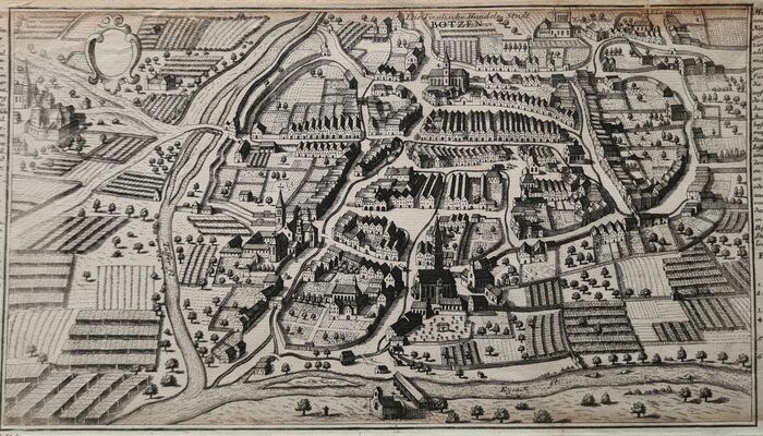 plattegrond van de stad Bolzano in Tirol uit een eerder werk van Matthaus Merian in 1649 en fijn gegraveerd door Gabriel Bodenehr gedrukt in 1704 het blad is licht geoxideerd maar in uitstekende staat, er zijn geen defecten aan het gegraveerde deel