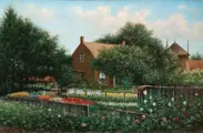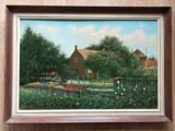 Met als voorstelling een Zomerse boerderij met een fleurige tuin met diverse bloemen en bomen in bloei,