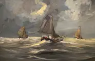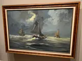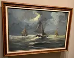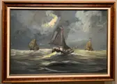 Hij laat hier met mooi warme kleuren,een prachtige compositie zien,van een drietal zeilschepen die zich een weg banen door een stormachtige nacht op zee naar de veilige haven.