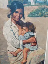 Dit kavel bevat een olieverf op doek door Jean Mulders in goede conditie uit 1964 mooi gedetailleerd werk , Moederliefde .