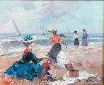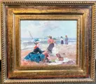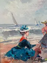 Prachtige olieverf op doek die "Dammes sur La Plage de Cannes" voorstelt