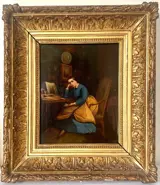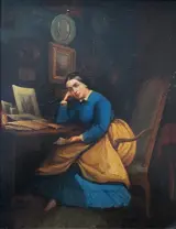 Dit olieverf op paneel schilderij uit 1865 toont een jonge vrouw in een burgerlijk interieur. De kwaliteit van het interieur is terug te zien in het meubilair en de vele schilderijen die aan de muren hangen. De jonge vrouw houdt een brief in haar hand en lijkt peinzend. Deze brief vormt een belangrijk verhalend element van het schilderij: wat staat er in deze brief dat deze jonge vrouw zo peinzend zou kunnen maken?