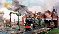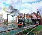 Tafel geschilderd in een realistische stijl bijna Naif met veel details en precisie op de locomotieven.