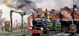 Speciale costumbrista-schilderij van de Engelse school die een van de meest geschilderde motieven van talloze kunstenaars vertegenwoordigt en op tal van manieren van afbeeldingen van treinen, locomotieven, gebruikersstations en andere soorten rijtuigen of trams.