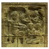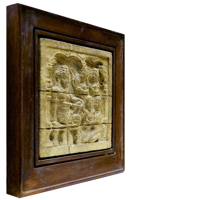 mooie kalkstenen reliëfreplica van de Borobudur uit 1987. In de Borobudur vind je dit grote stuk op de eerste galerij op de balustrade, hoog gemonteerd.